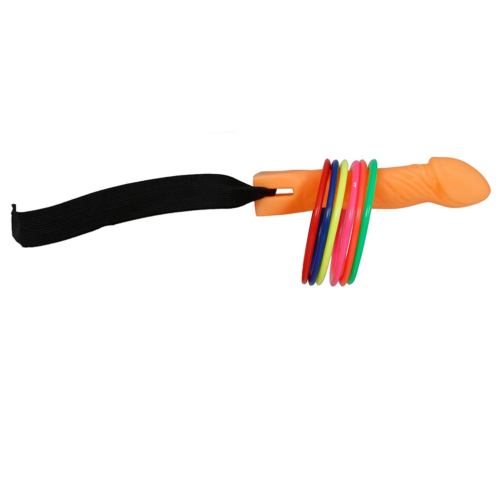 Wurfspiel mit frechem und unterhaltsamem Design. Es verfügt über ein penisförmiges Ziel und farbige Ringe zum Werfen - konzipiert, um Ihre privaten Feiern und Junggesellenabschiede für Erwachsene aufzulockern.