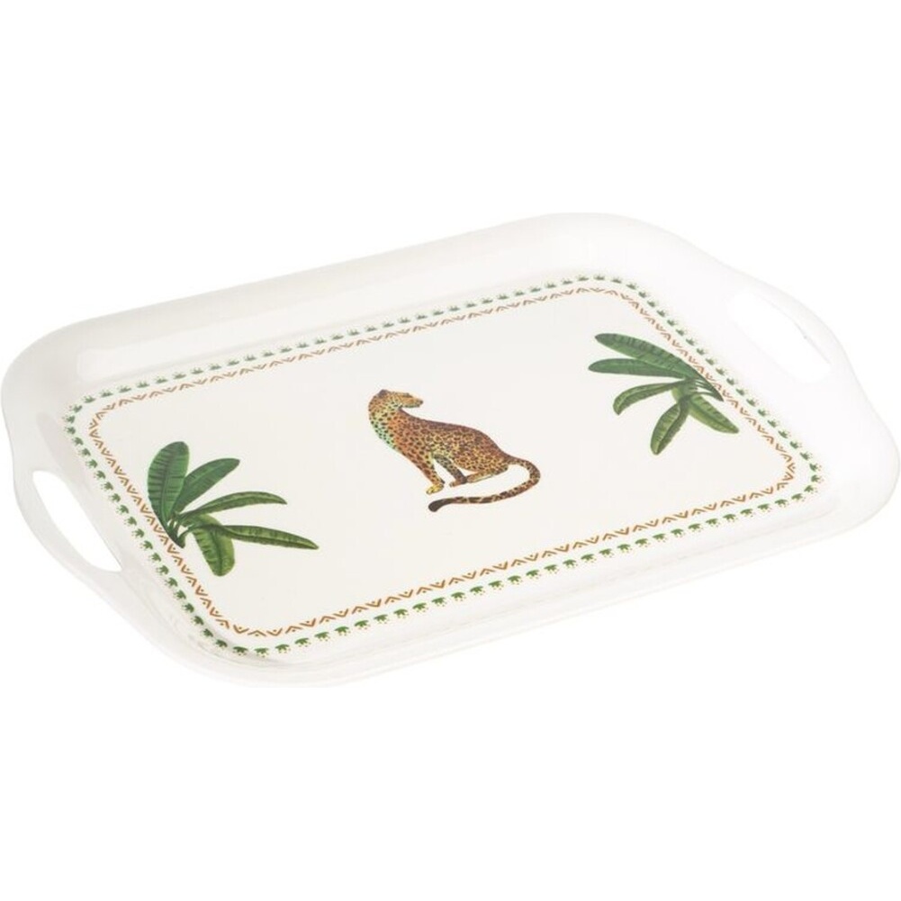Das dekorative Zahara-Tablett verleiht Ihrem Tisch mit seinem auffälligen Motiv des tropischen Jaguars einen exotischen und eleganten Akzent.